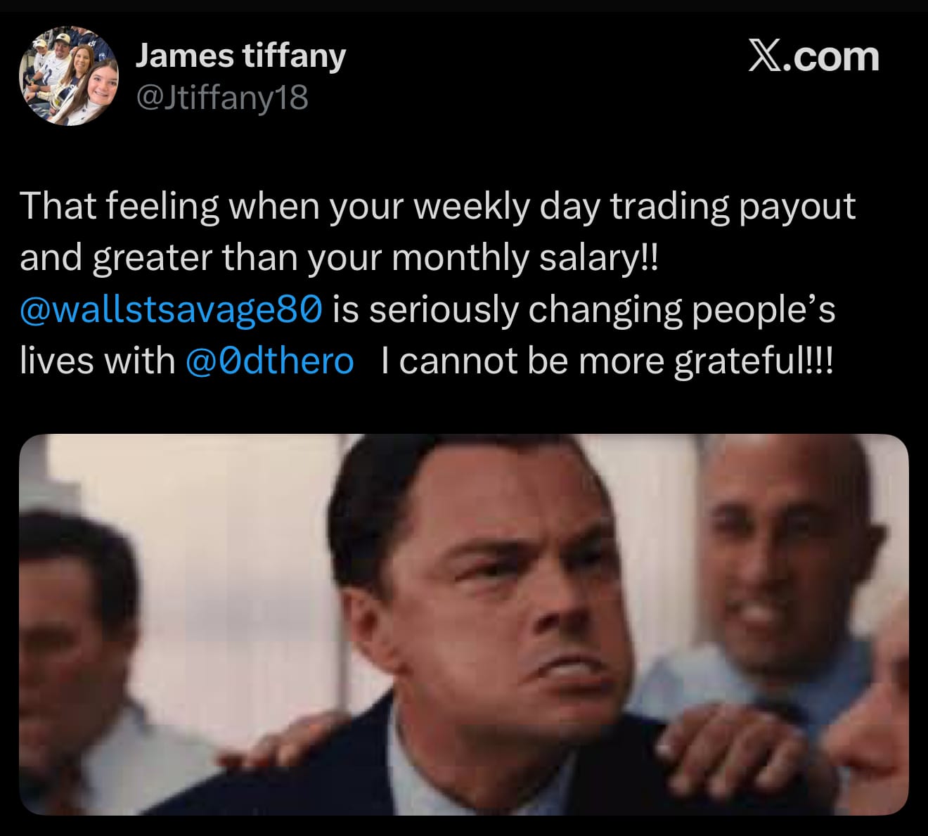 "That feeling when your weekly day trading payout is greater than your monthly salary!! @wallstsavage80 is seriously changing people's lives with @0dthero. I cannot be more grateful!!!!"