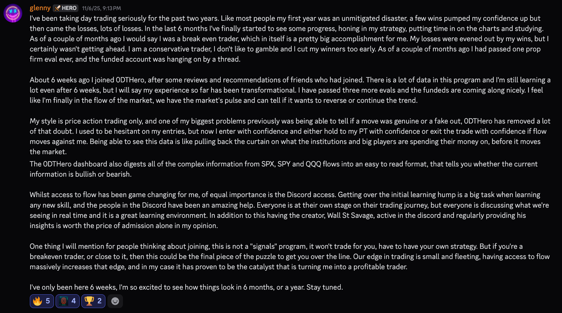 "Our edge in trading is small and fleeting. Having access to flow massively increases that edge, and in my case it has proven to be the catalyst that is turning me into a profitable trader."