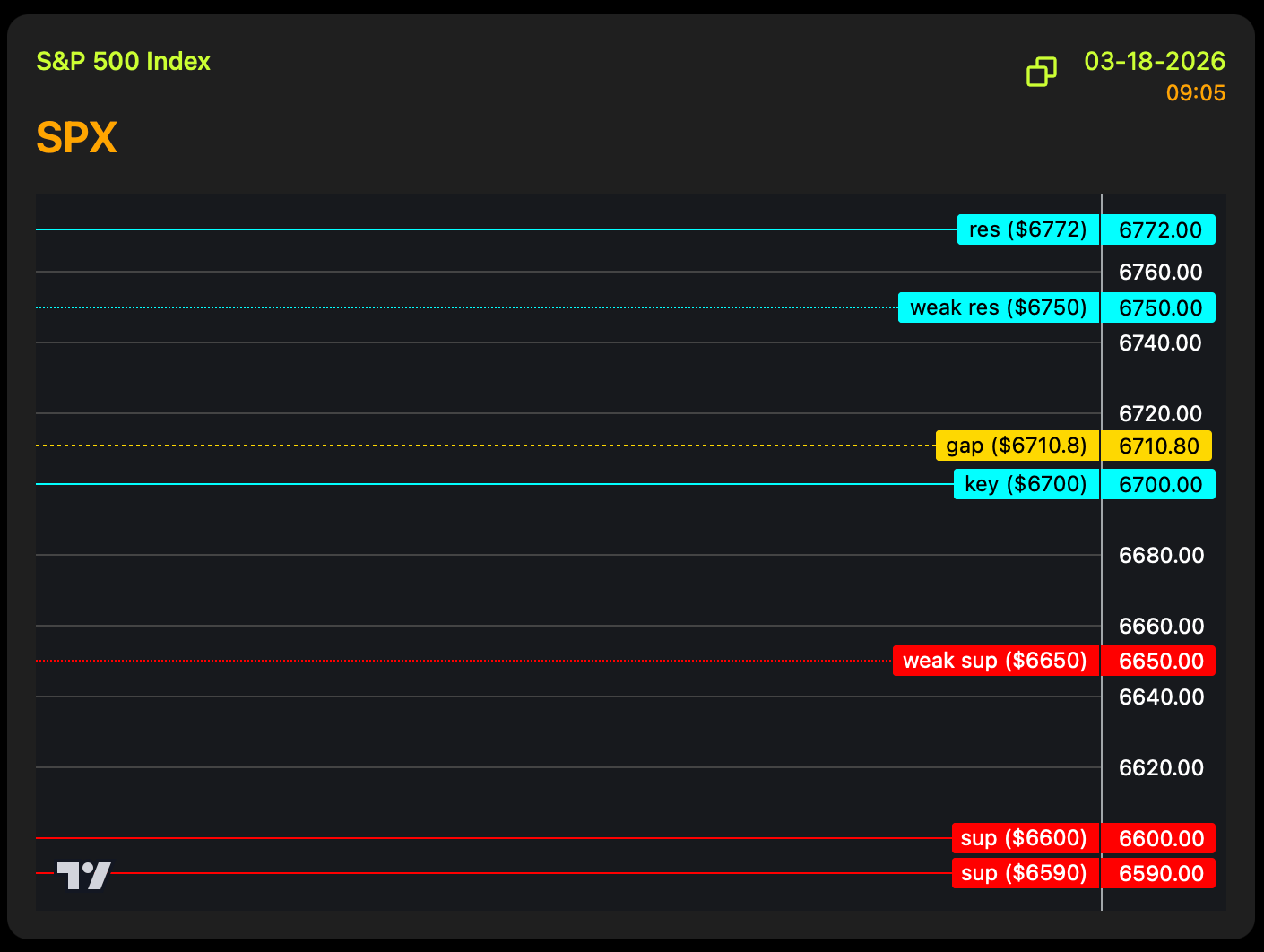 We also want to mention that we lost 6700 SPX implied pre-market, gapping down. We've been saying that above 6700, 6800 SPX is likely — so we'll see if we can recover that level today.