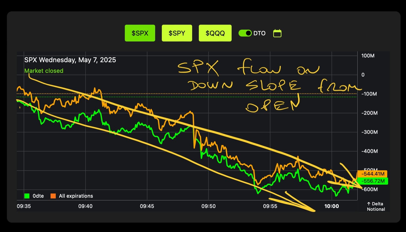 Right from the open, $SPX flow wanted nothing to do with upside — diverging from $ES price action. That’s what we call slope divergence between flow and price.