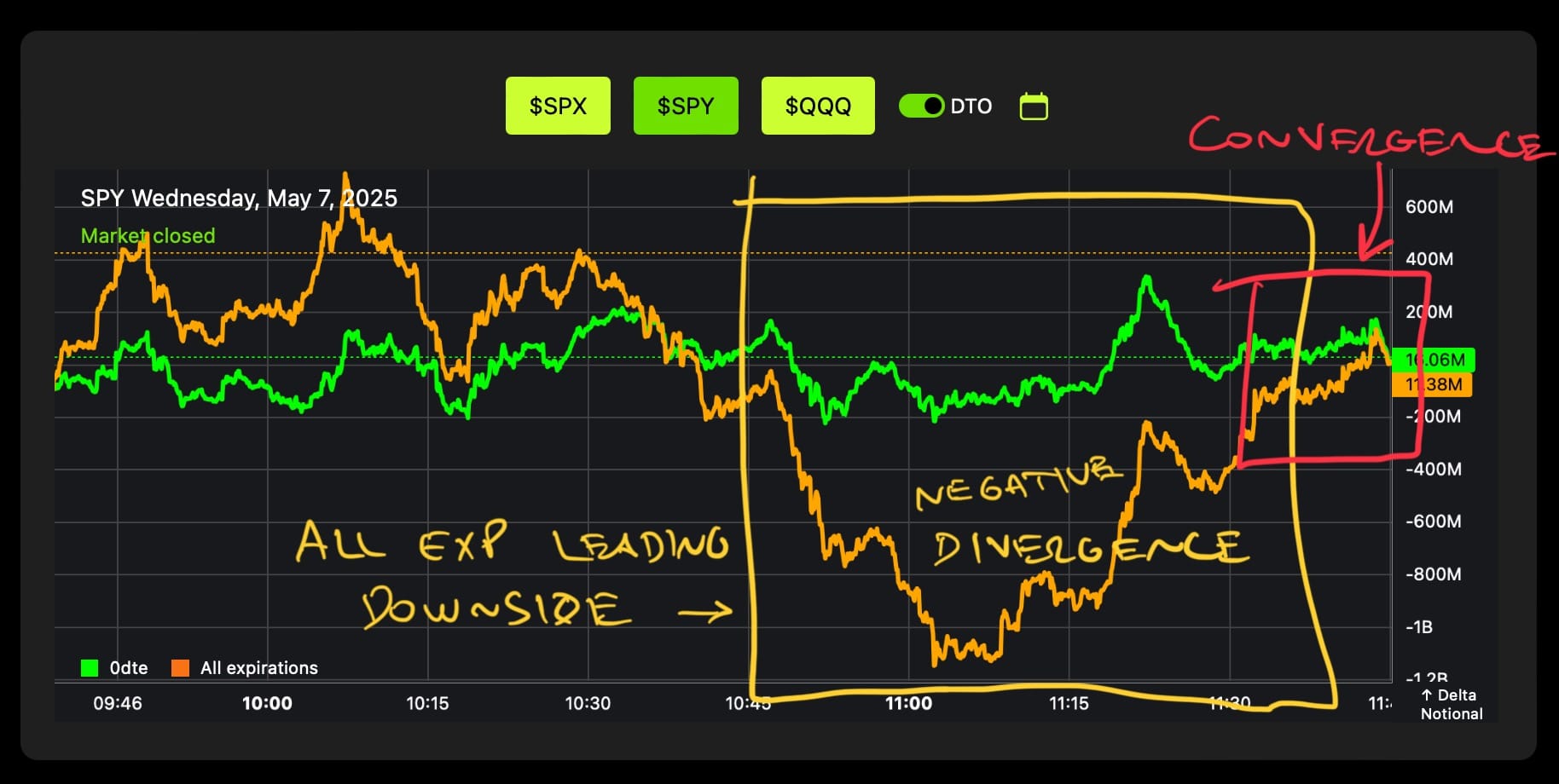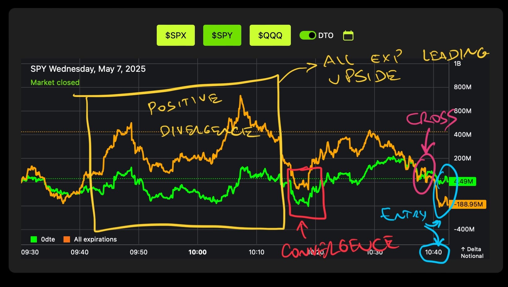 What I wanted to see next was convergence followed by a flow cross — $SPY flow aligning and giving me multiple points of confirmation on the price reversal.