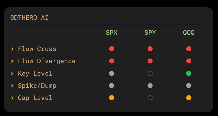Flow Cross, Flow Divergence, Key Levels, Spike/Dump, Gaps – all the market forces behind your NQ and ES futures trades plus 0DTE options, visible instantly. When you see "QQQ bullish flow cross" while you're long NQ, you KNOW to hold.