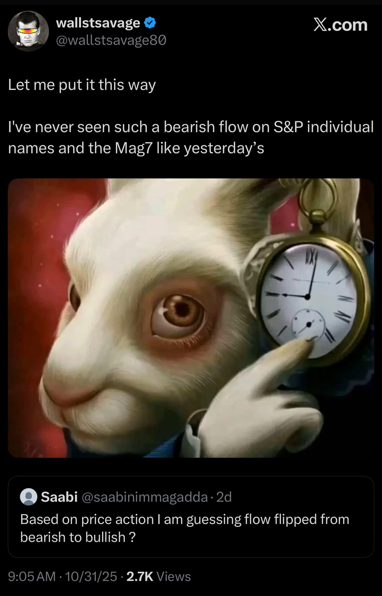 Deep bearish flows across the board in the Mag7. We’re of the impression that if $GOOGL didn’t have a strong Q3, we’d already be near 6,700 SPX by now.